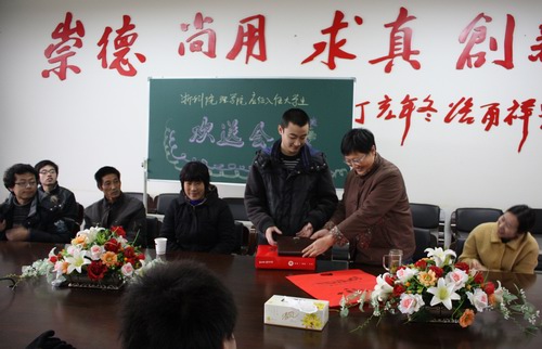 和班级分别给柳健康赠送了纪念品,并合影留念。