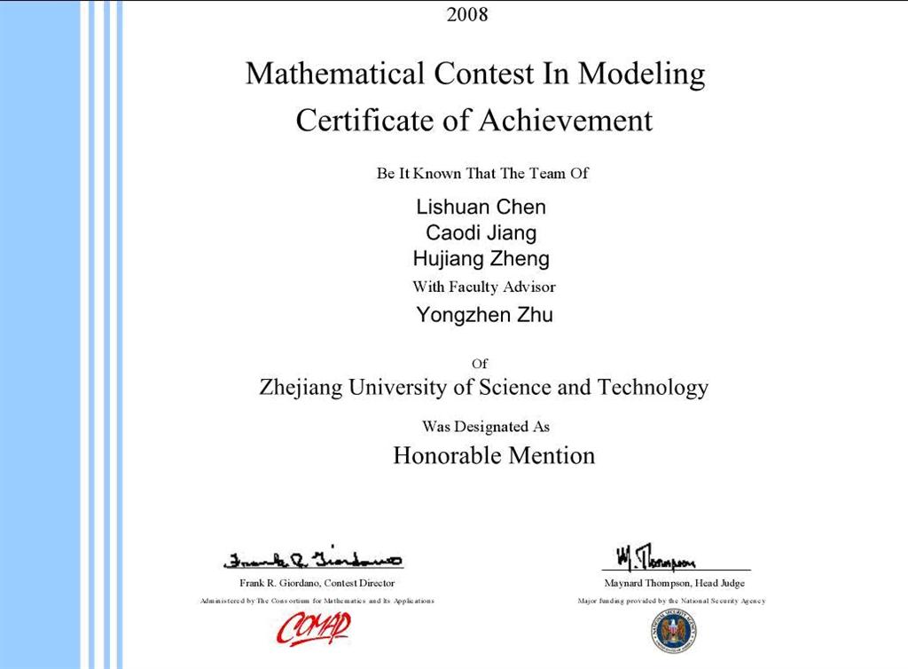 陈理闩、江曹弟、郑湖江一组获“美国国际大学生数学建模竞赛Honorable Mention(即二等奖)”,卢朱娜、朱晓平、章文君(电气国产自拍